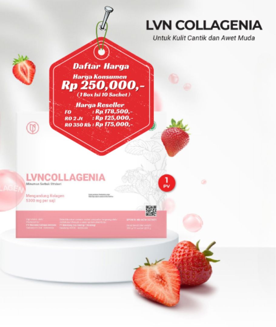 LVN Collagenia adalah minuman serbuk dengan rasa stroberi yang lezat, diformulasikan khusus